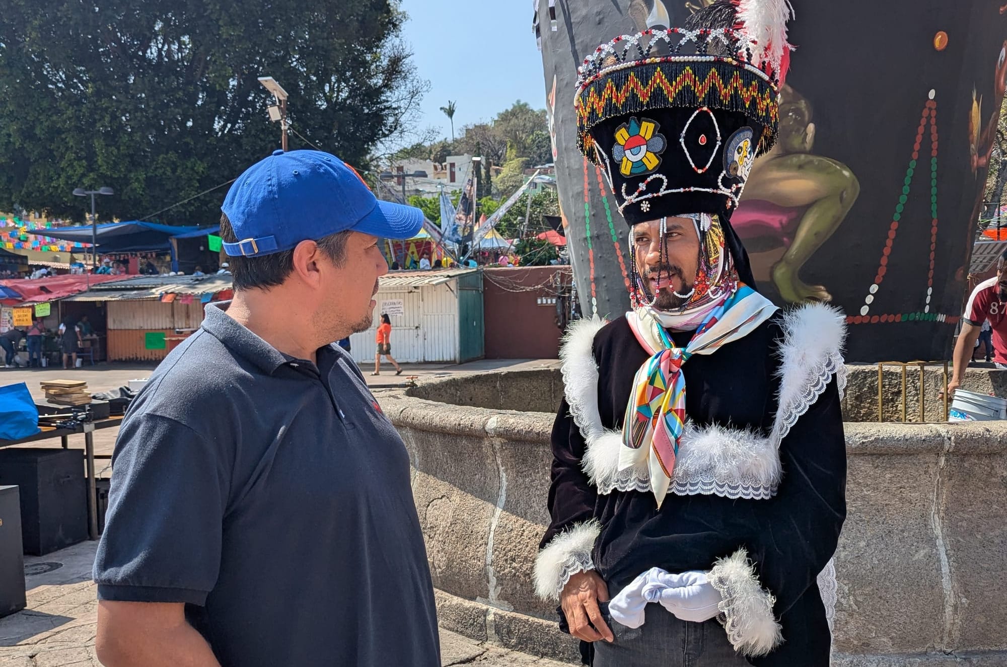 We made our way to the zócalo, the main square, where we found the day’s schedule - purported - and Mario chatted with a man wearing the robe of a Chinelo and holding in his arms the delicately beaded crown and mask.