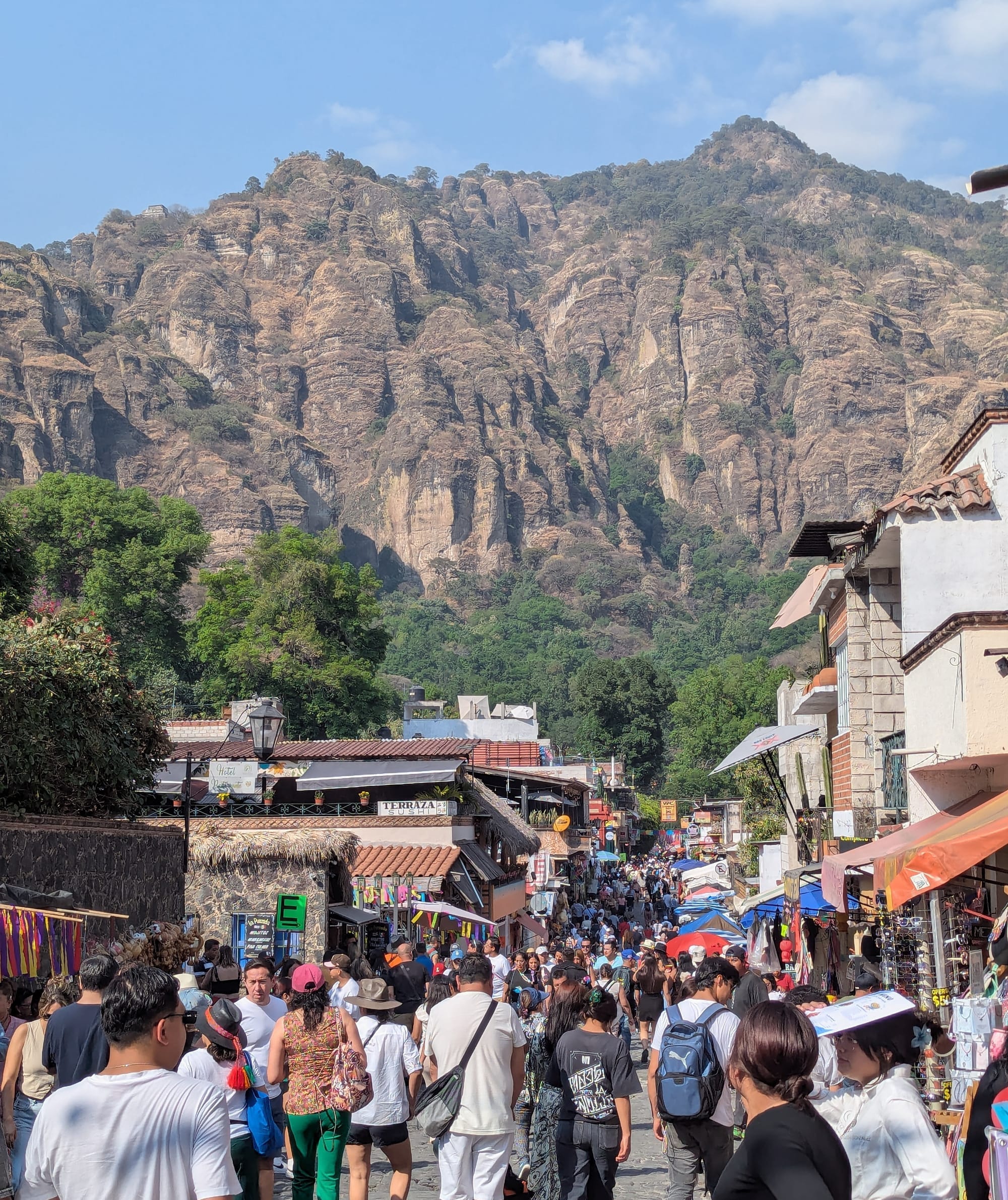 Tepoztlán - a Nahuatl name meaning “place of abundant copper” - is stunning and overtouristed. It’s hard to separate the two these days. The village sits below a ridge topped by an Aztec temple, the main street looking straight up toward the mountains. At the end of the street you can enter a protected area and hike up to the temple, and by “hike” I mean climb a thousand feet of stairs. The main street, being overtouristed, is full of bars and restaurants, hotelitos, and shops offering actual crafts and other shops offering trinkets. On this day, it was also crammed with people, and that was at 1:30 or so in the afternoon.