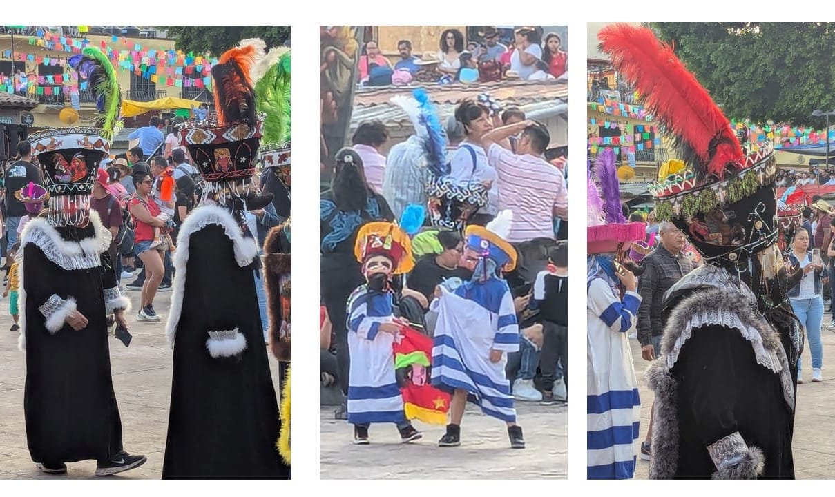 Chinelos emerged as a way to mock the Spanish a couple hundred years ago. They wear elaborate robes and crowns, and traditionally have blue eyes and long, pointed beards, and do a clownish dance. They can be found in various places in Mexico, but originated and are most frequently found in the state of Morelos, where the Spaniards, and their heirs, maintained haciendas for the production of sugar and were particularly oppressive to the native or Mestizo workers.