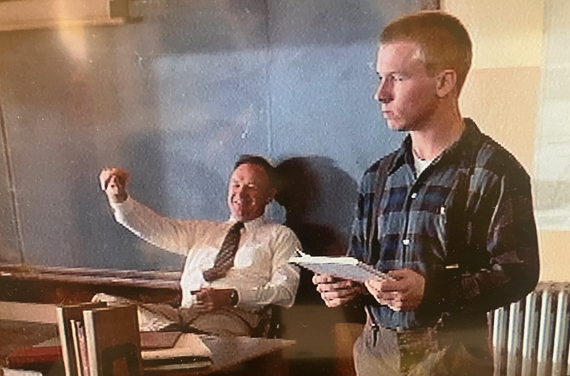 The scene takes place in Norman Dale’s social studies classroom, almost the only time we see him teaching. It’s basically a long establishing shot, showing Dale in the school just before Miss Fleener, now acting principal in place of the man who hired Dale, informs him that the townspeople are about to vote to fire him. (Miss Fleener would be a more impressive figure, and a worthier mate, if she made some effort to stand up to the horde that arrives with pitchforks and torches, but that’s a different movie.)