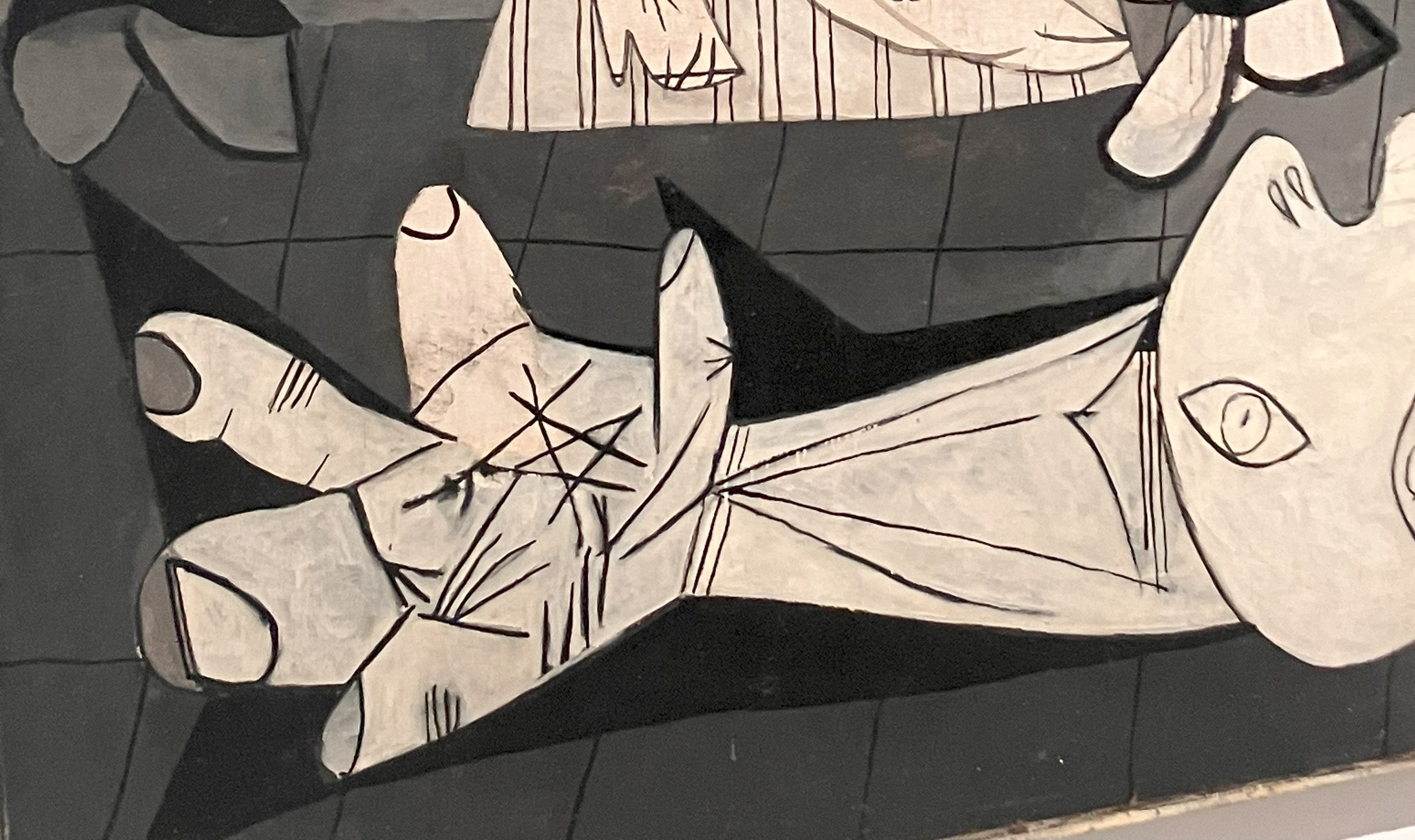 So Picasso, painting Guernica in this context, Madonna and child and Christ on the cross deep in his soul. In his art, whether he wants them there or not. And he places them, in his dismembering way, in this monumental painting, a painting whose scale alone determines that it will be his masterwork. And I look at it again and think, “Is he offering us hope? With that hand down there, in the lower left, is he reminding us how this will work out?”