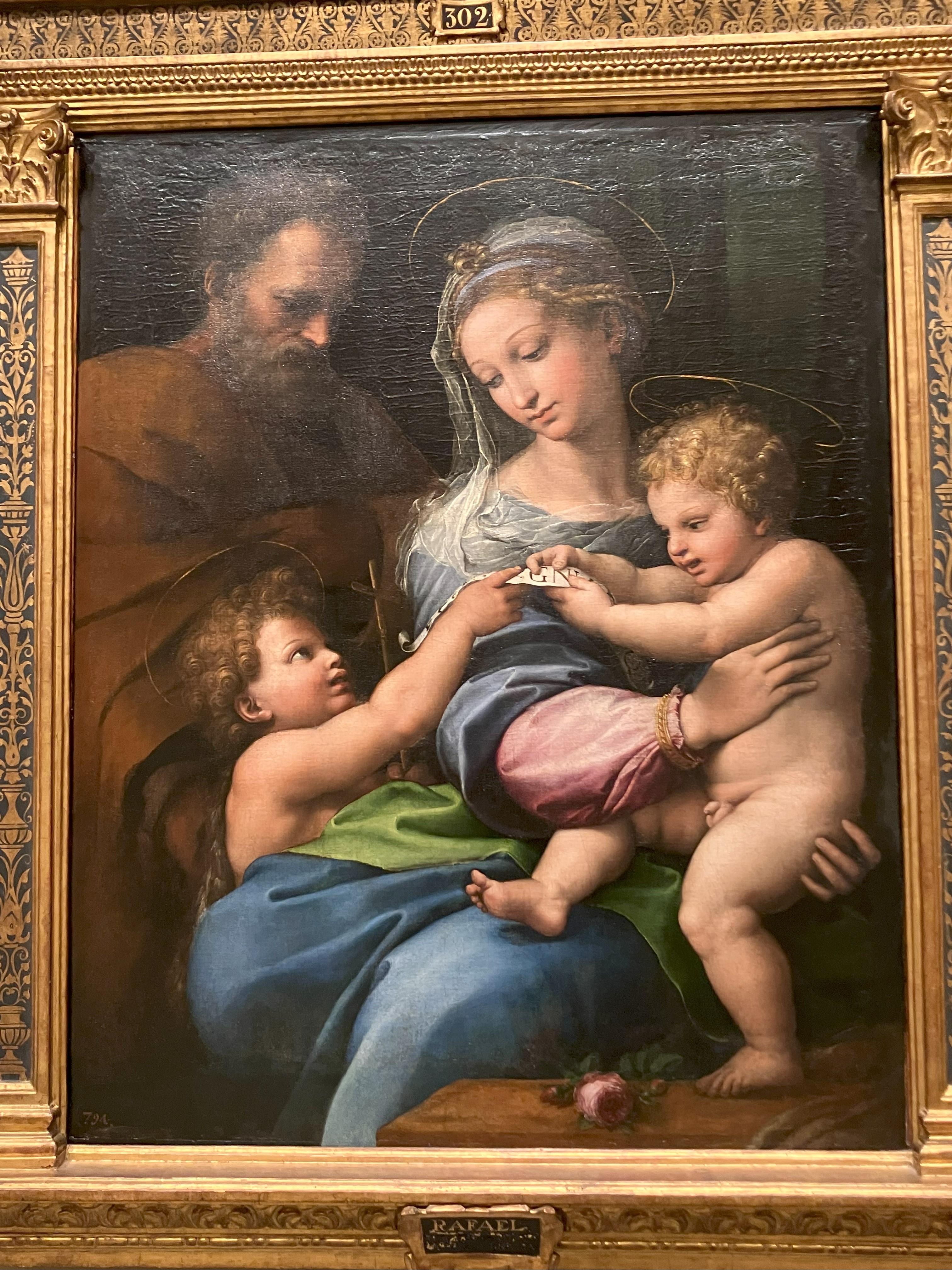But also, knowing nothing about art history, I snapped this photo because I was amused that St. Joseph is holding a cross and I was going to make some snide comment on Facebook about whether Raffy was aware of his anachronism. Well, of course he was: Everything is a choice, Raphael put that cross there for a reason. As I read in the explanatory cards of painting after painting of the infant Christ and an anachronistic cross, the juxtaposition was meant to symbolize Jesus’ awareness of his divinity, even in his infancy.