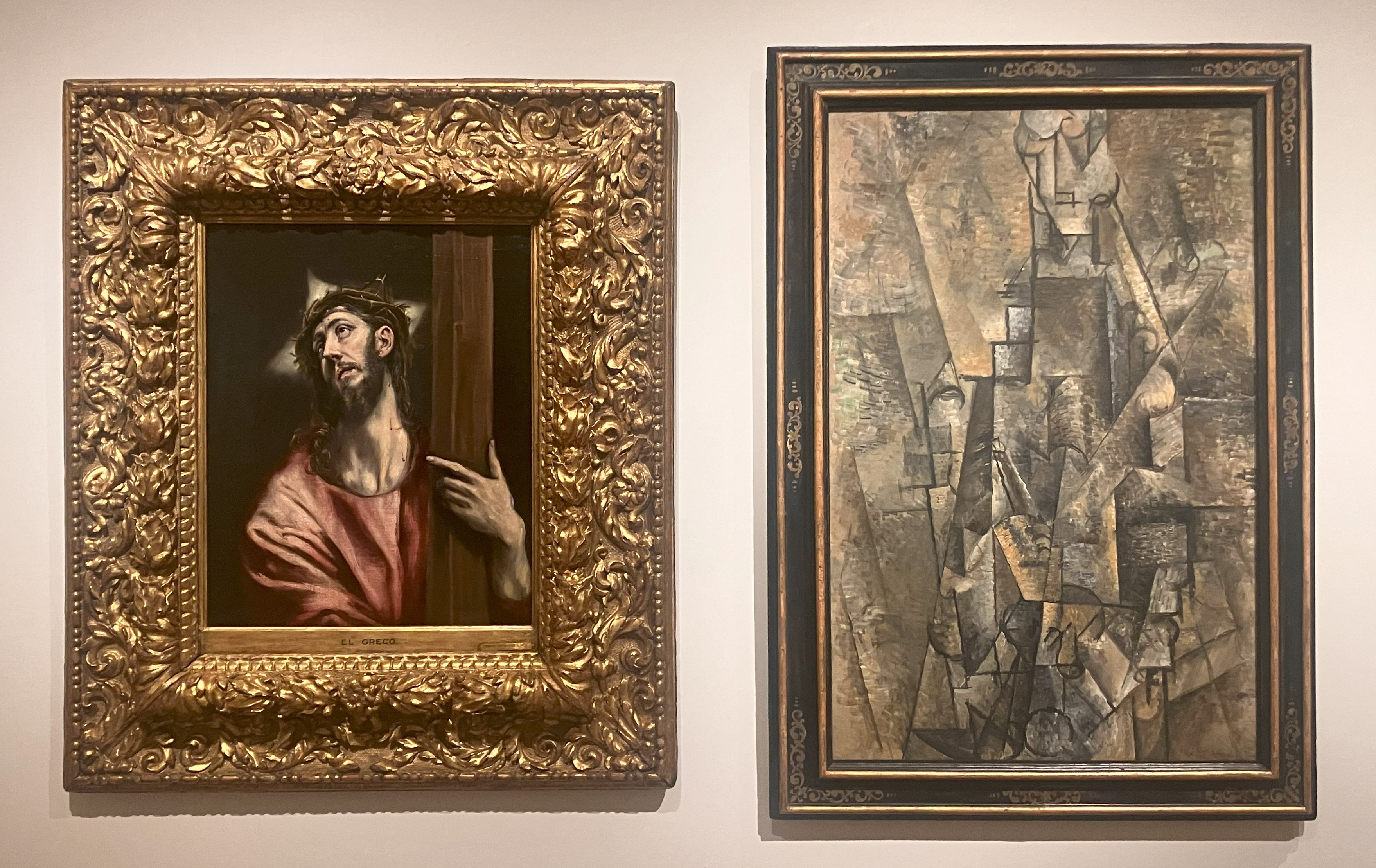 I owe the Thyssen-Bornemisza museum for helping crystallize this thinking; they had an exhibition called “Picasso: The Sacred and the Profane” that happened to be up when I ducked in there. It juxtaposed works by Picasso with his progenitors, like this pairing of El Greco’s Christ with the Cross with Picasso’s Man with a Clarinet.