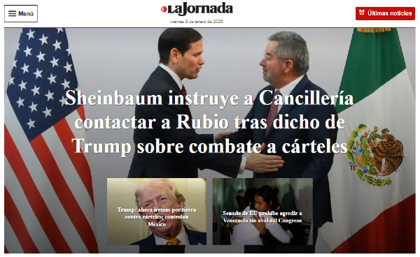 “Sheinbaum instructs the Chancellor to contact Rubio after Trump's statement about combatting cartels,” as La Jornada put it - a tone that seems quite careful, but my sense of Sheinbaum is that that’s kind of her M.O. She’s something of a poker player. Maybe that’s why she didn't smile at me.