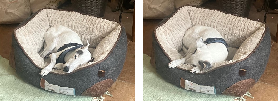 I considered breaking out the gabapentin, if only to let him sleep, but he hates the taste, and I’m not sure about its effect on his digestive tract. Sooner or later he looked at his bed, and I helped him in it, and he dozed for a while before the process repeated again.